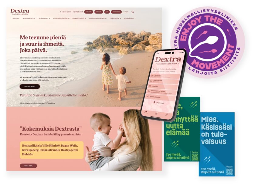 Laadimme brändi-, markkinointi- ja viestintästrategian yhdessä Dextran henkilöstön kanssa. Uudistimme brändin, verkkosivuston, markkinointimateriaalit ja aloimme toteuttamaan viestintään ja digitaalisiin kanaviin keskittyvää jatkuvaa markkinointia. Osana bränd- uudistusta muutimme yrityksen nimen Dextra Hedelmällisyysklinikaksi (ennen Lapsettomuusklinikka). Toimimme nyt asiakkaan strategisena kumppanina ja meille on ulkoistettu markkinoinnin operatiivinen, jatkuva toteuttaminen ja sen tulosten mittaaminen.